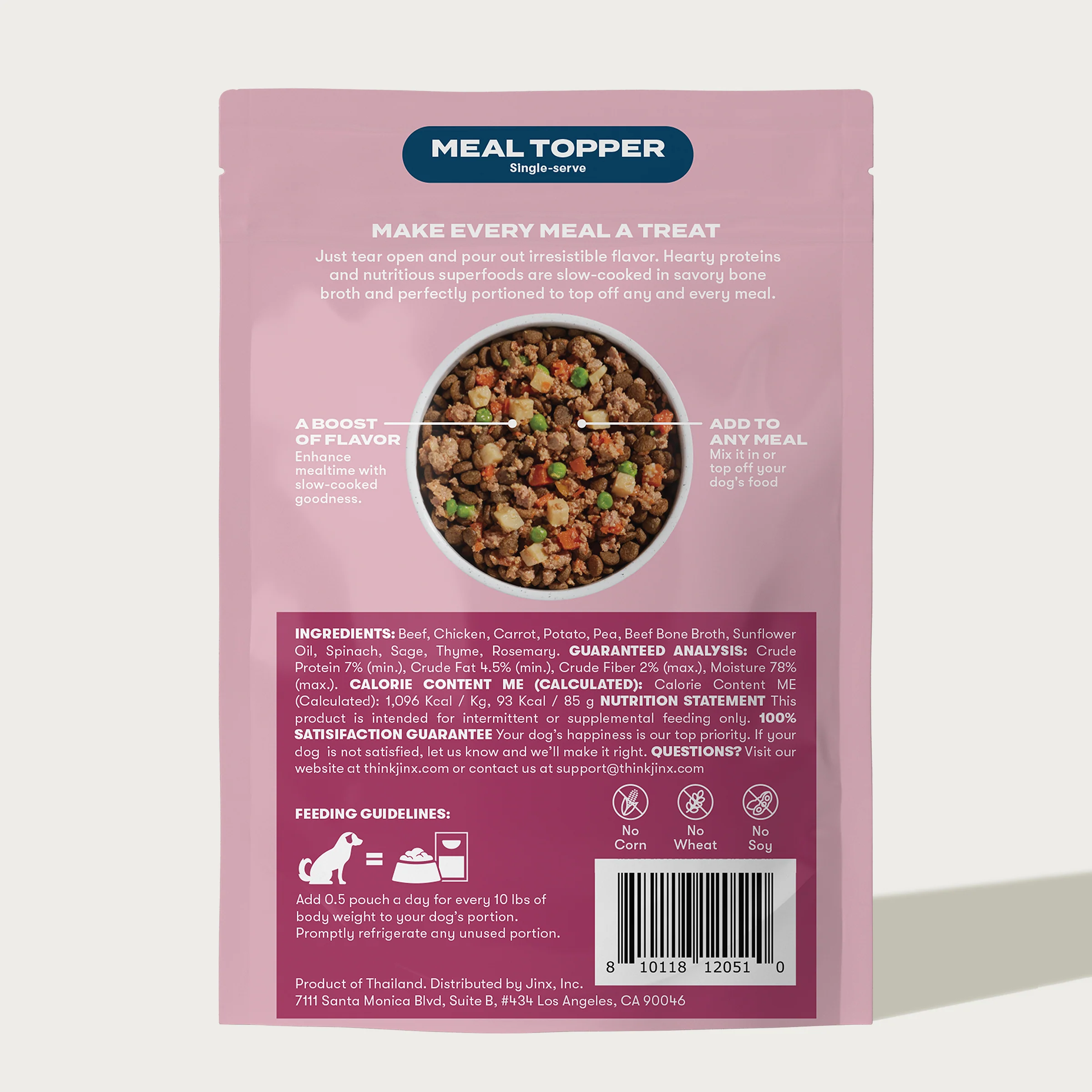 Jinx Beef & Chicken Single-Serve Homemades make every meal feel like treat time. High-quality protein is the #1 ingredient in this tasty single-serve meal topper, along with nutritious superfoods to support your dog’s immunity. Jinx Homemades are slow-cooked to perfection in savory bone broth for nutrient density and give your dog’s bowl a boost of mouth watering flavor. Just tear open and pour on this irresistible (and healthy!) food topper. Trust us, your dog’s never been more excited for mealtime.